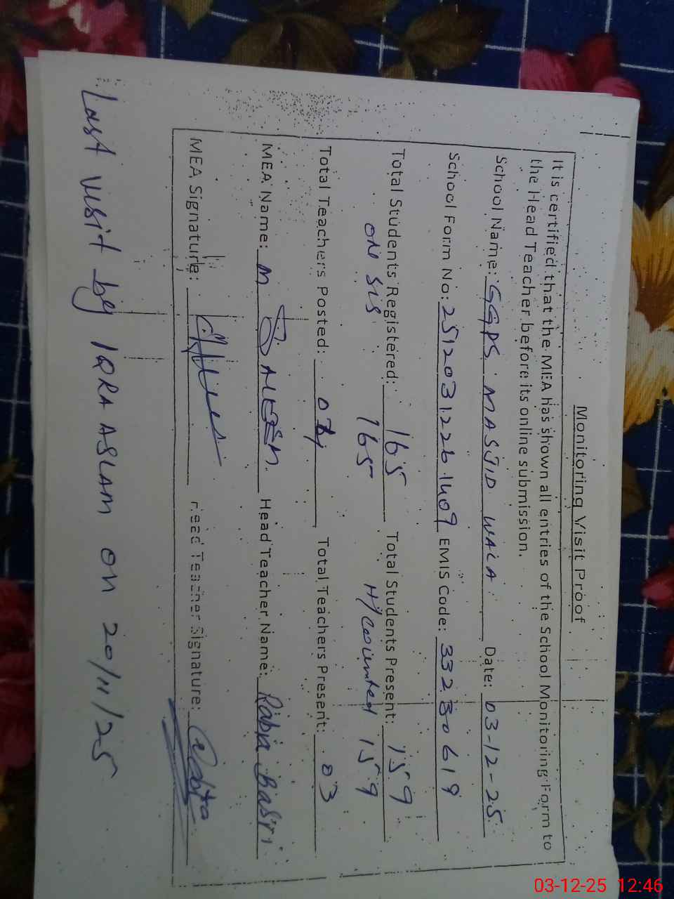 | EMIS Code: 33230619 | Name of School: GGPS MASJID WALA | |||