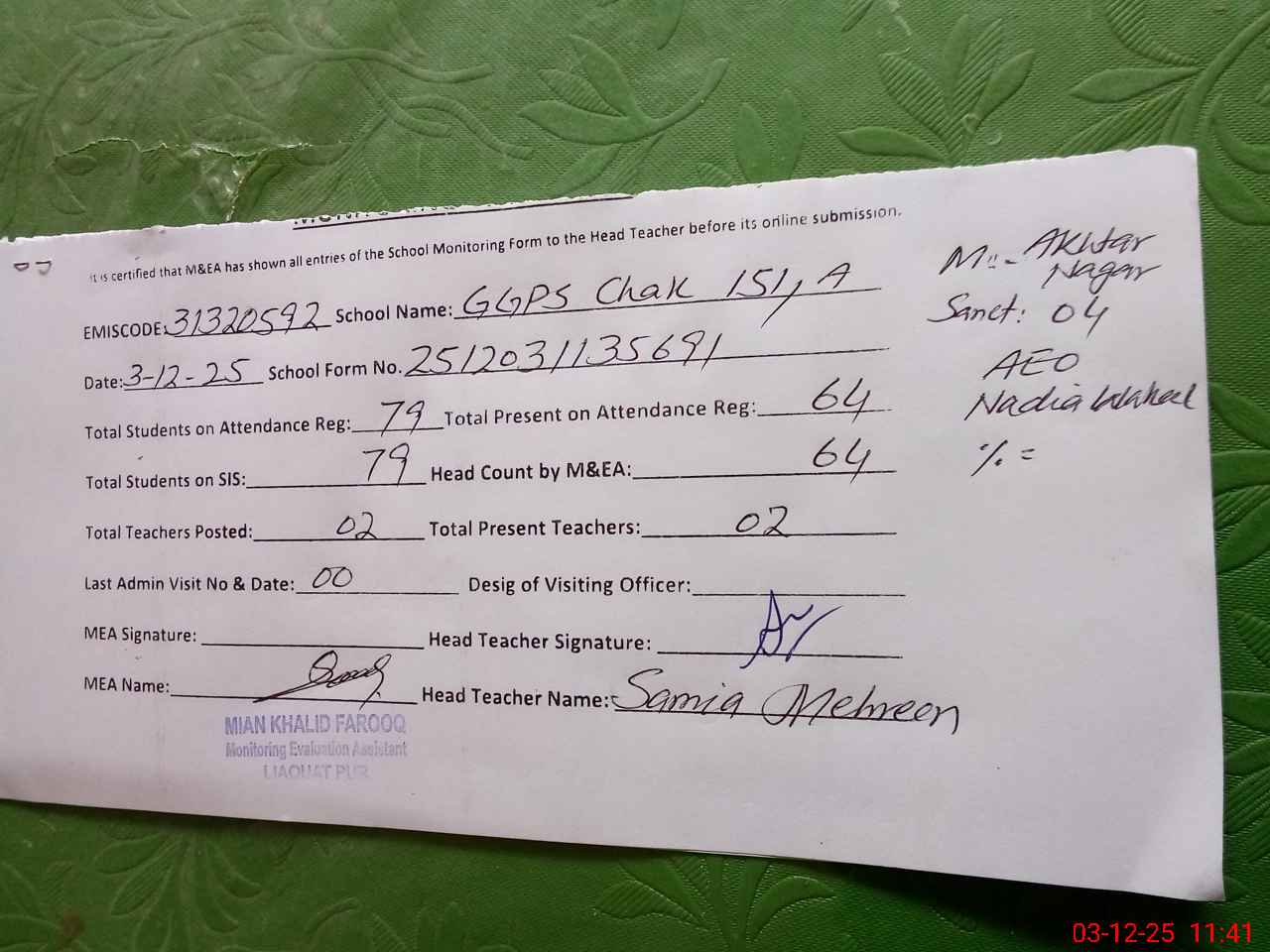 | EMIS Code: 31320592 | Name of School: GGPS CHAK NO. 151/A | |||