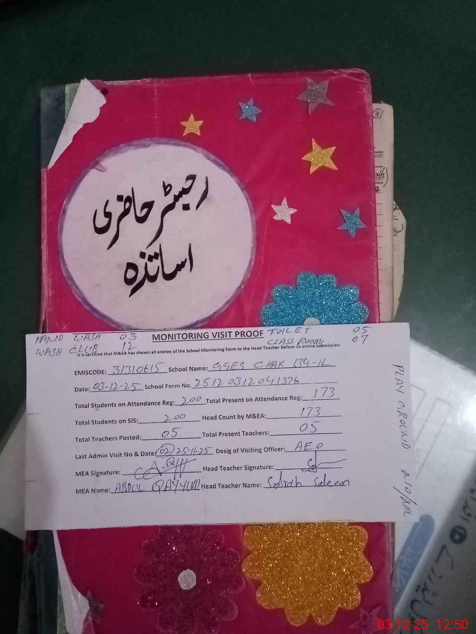 | EMIS Code: 31310615 | Name of School: GGES CHAK NO 134/1-L | |||
