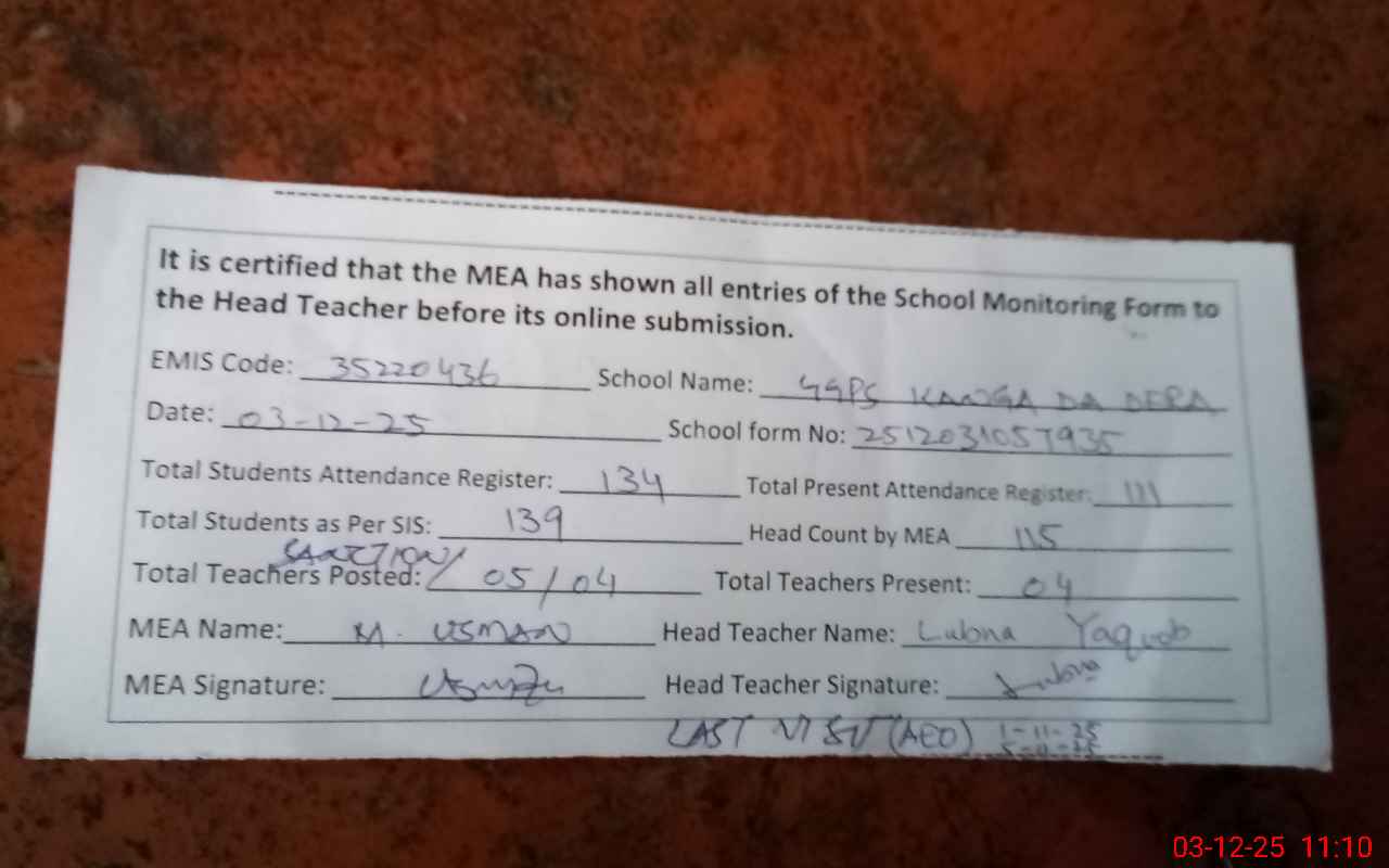 | Attendance Register | Head Teacher | MEA with School | Visit Proof |