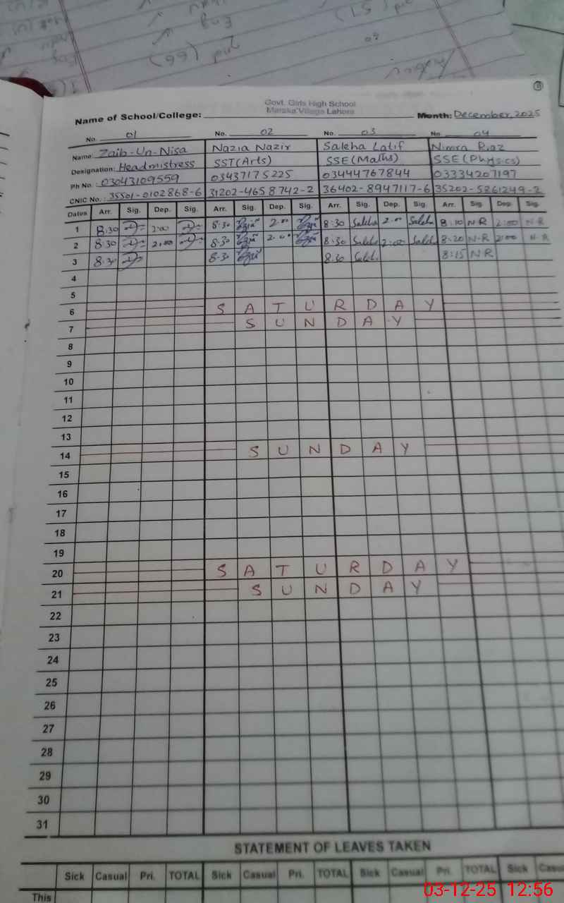 | Name: Za**** Designation: (School Headmaster's/Headmistress's) Head Mistress Phone/Cell Number: 03**** |