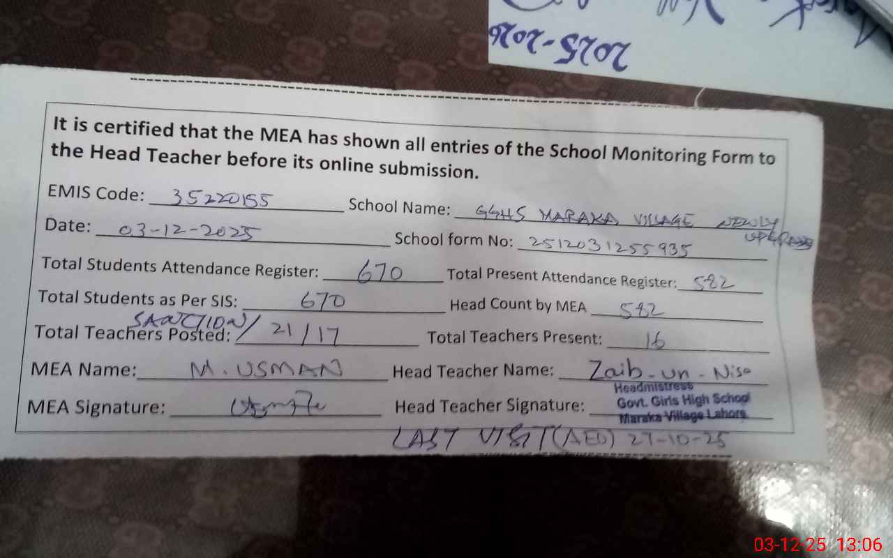 | Attendance Register | Head Teacher | MEA with School | Visit Proof |