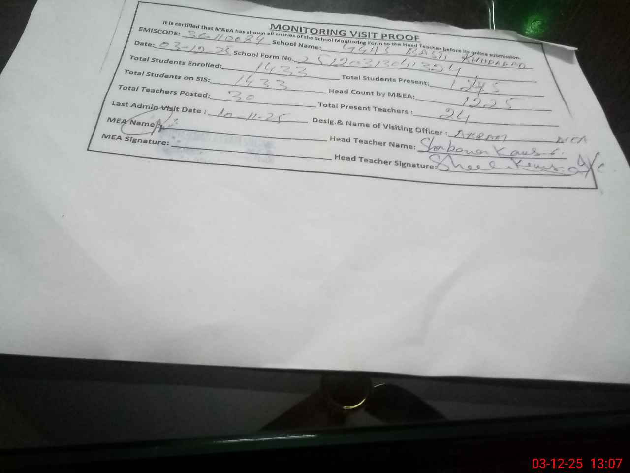 | Attendance Register | Head Teacher | MEA with School | Visit Proof |