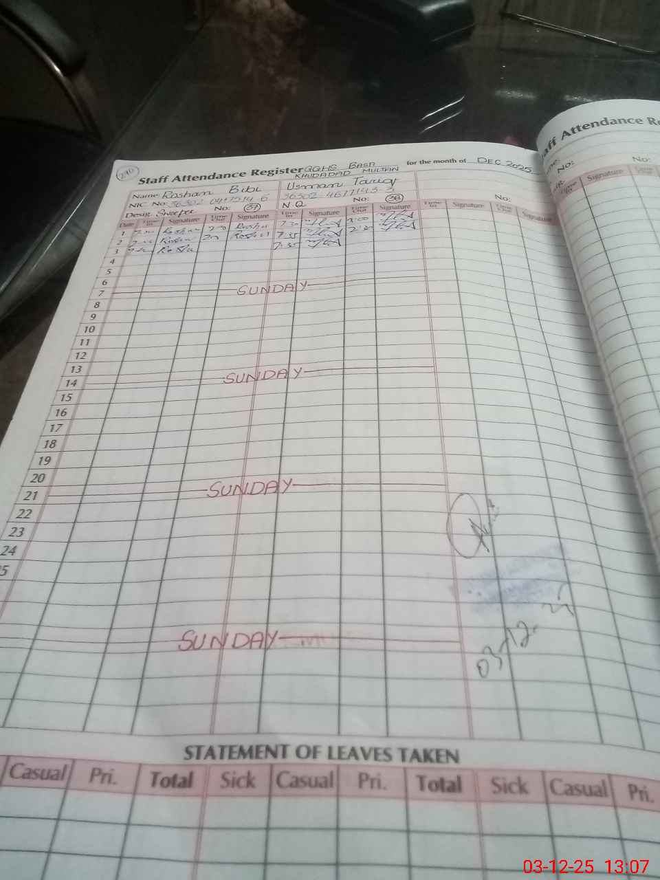 | CNIC | Full Name | Designation | R/C | Absence During Last Calender Month |