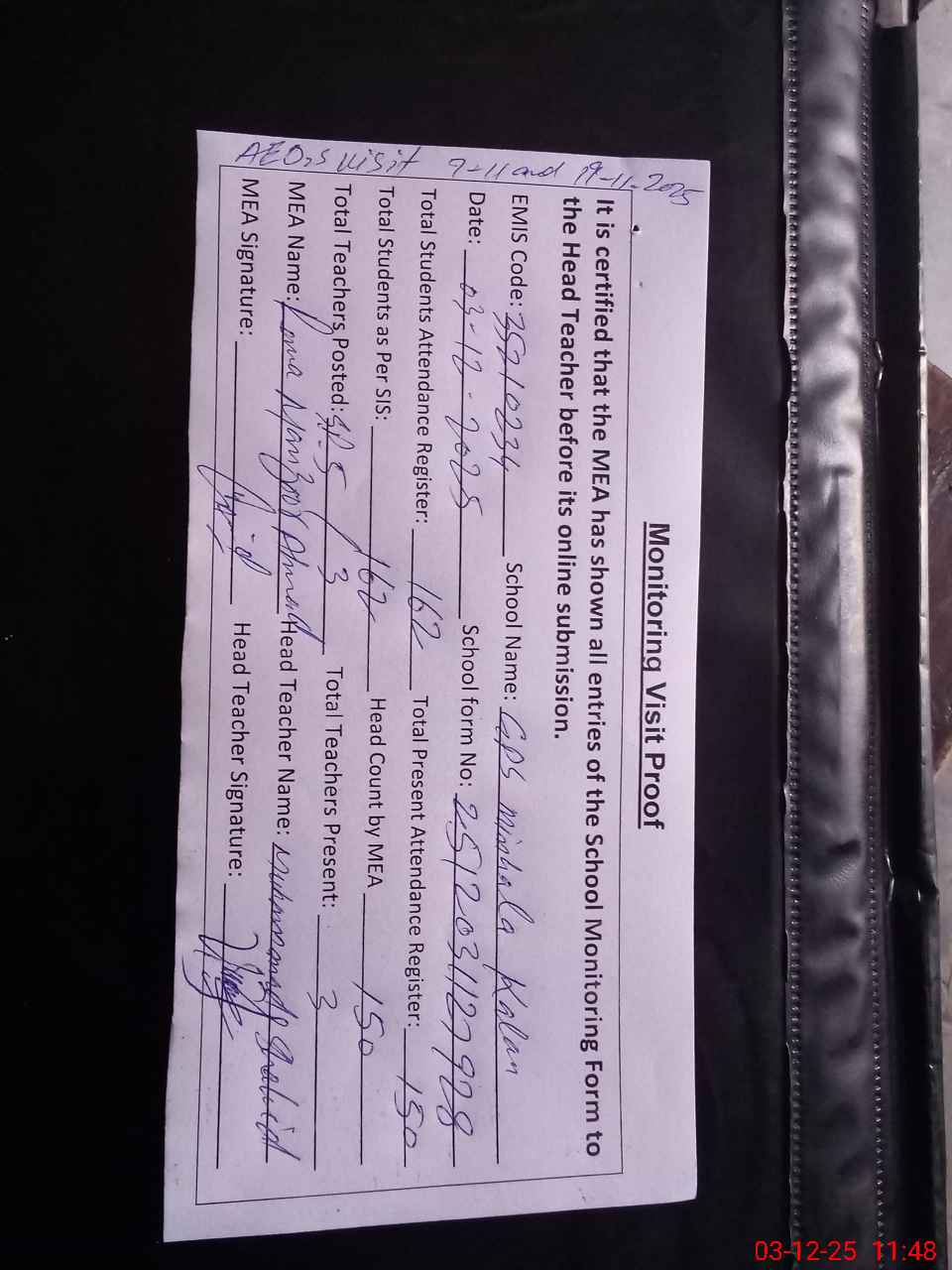 | Attendance Register | Head Teacher | MEA with School | Visit Proof |