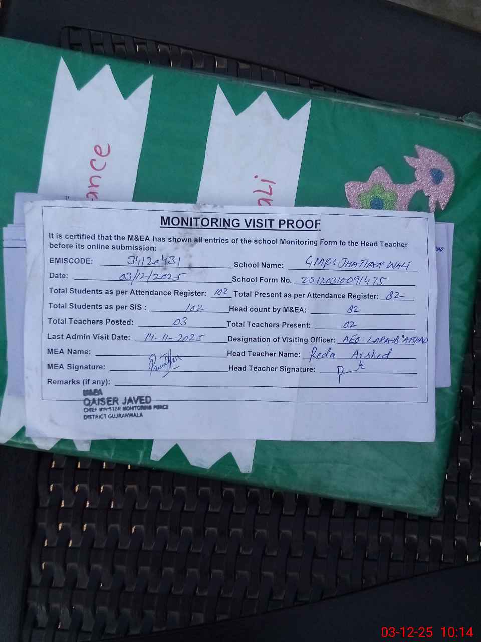 | EMIS Code: 34120431 | Name of School: GMPS JHATTAN WALI | |||
