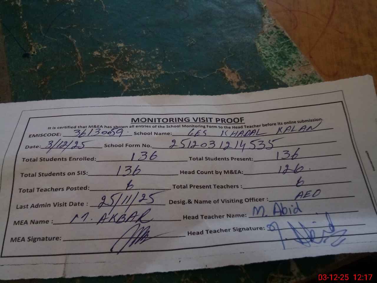 | Attendance Register | Head Teacher | MEA with School | Visit Proof |