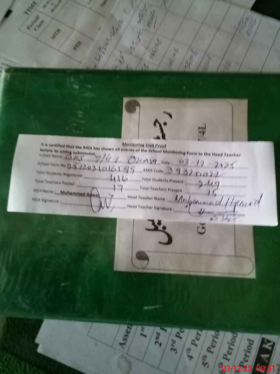| Attendance Register | Head Teacher | MEA with School | Visit Proof |