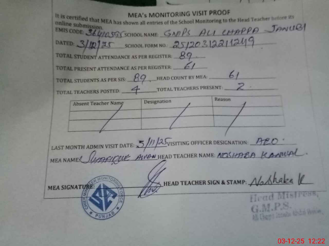 | EMIS Code: 36410595 | Name of School: GMPS ALI CHAPPA JANUBI | |||