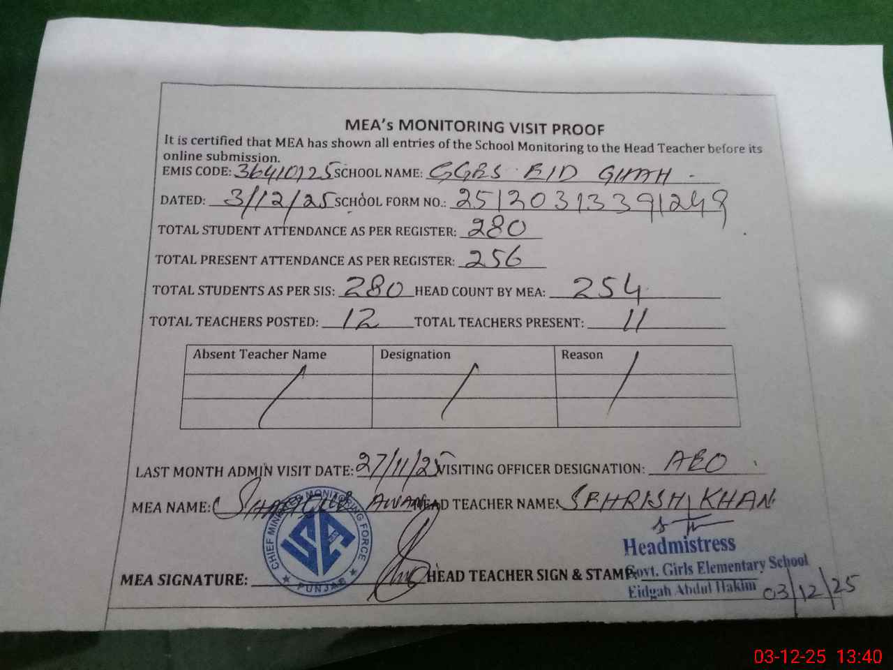 | Attendance Register | Head Teacher | MEA with School | Visit Proof |