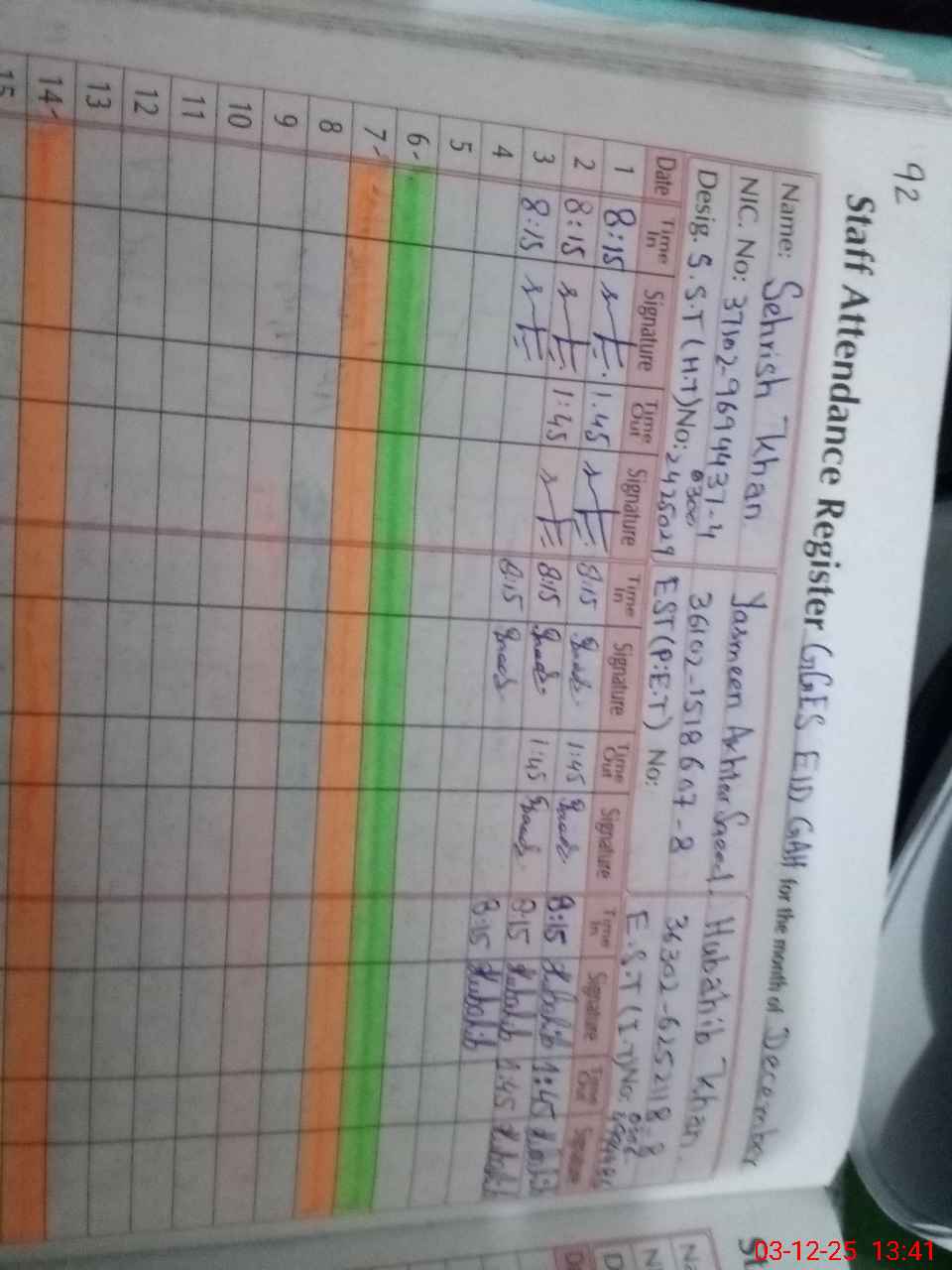 | CNIC | Full Name | Designation | R/C | Absence During Last Calender Month |
