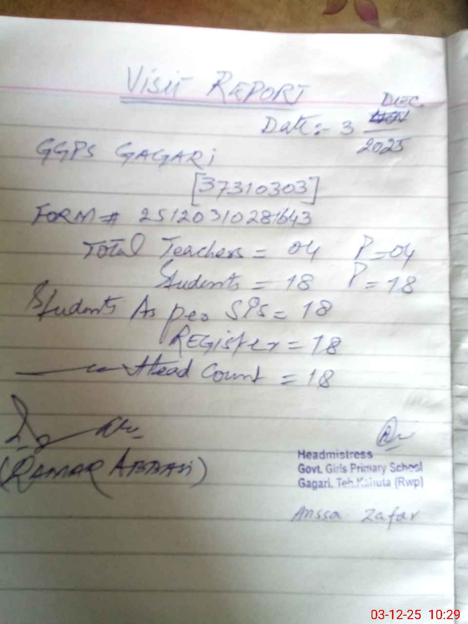 | Attendance Register | Head Teacher | MEA with School | Visit Proof |