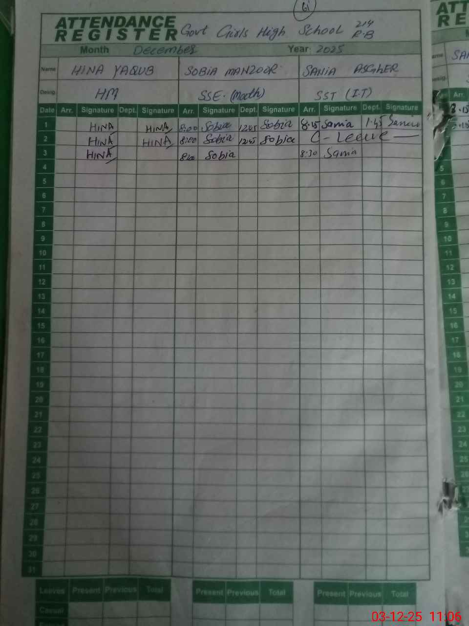 | CNIC | Full Name | Designation | R/C | Absence During Last Calender Month |
