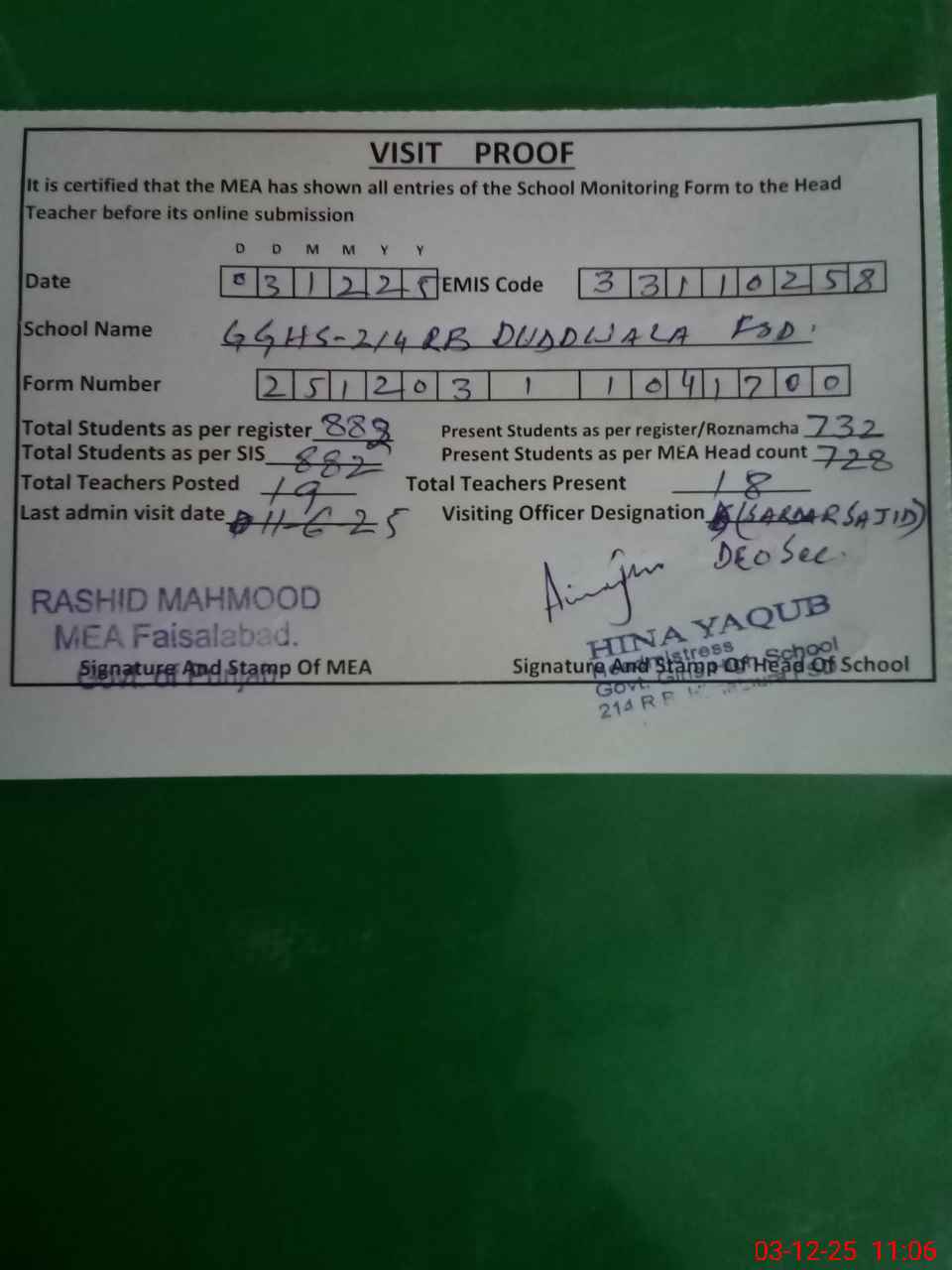 | Certified that this School was Inspected by the Undersigned MEA/DMO Today and the Information Stated Above is as Per Record. | |||||