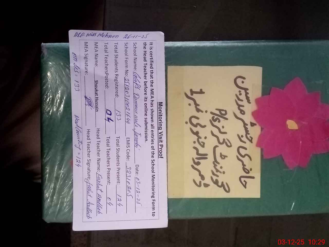 | Attendance Register | Head Teacher | MEA with School | Visit Proof |
