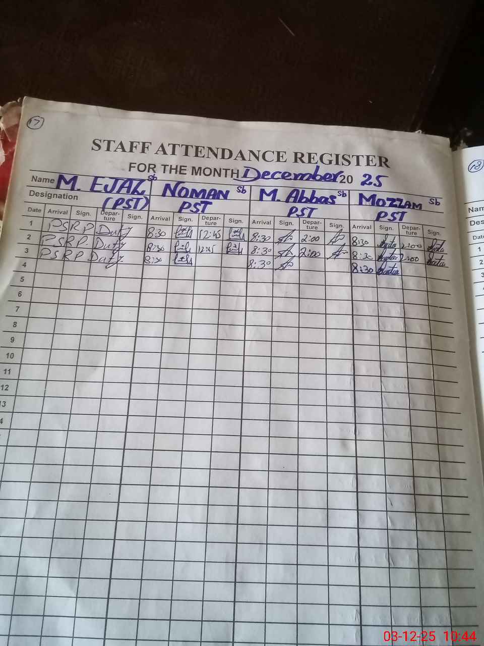 | CNIC | Full Name | Designation | R/C | Absence During Last Calender Month |