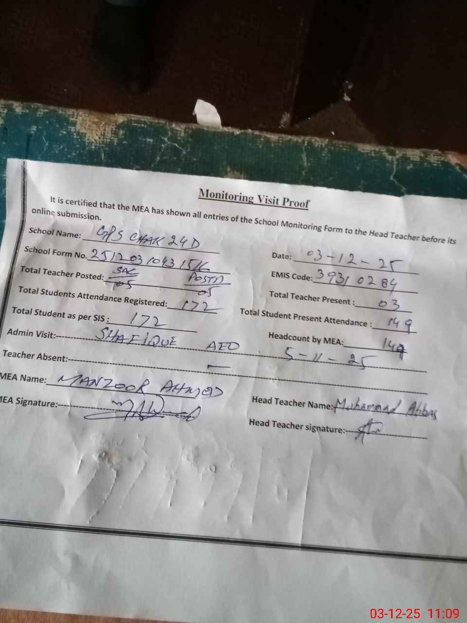 | Attendance Register | Head Teacher | MEA with School | Visit Proof |