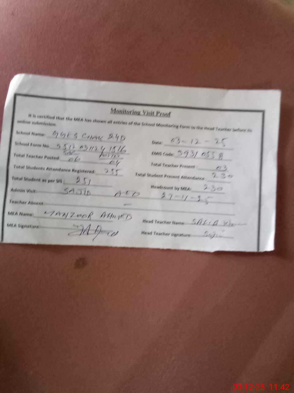 | Attendance Register | Head Teacher | MEA with School | Visit Proof |
