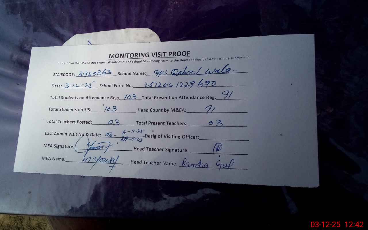 | EMIS Code: 31330363 | Name of School: GPS QABOOL WALA | |||
