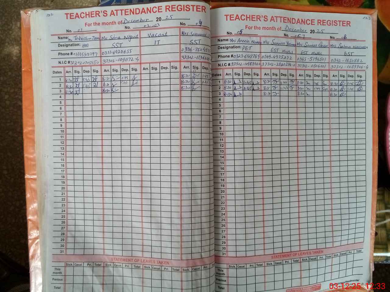 | CNIC | Full Name | Designation | R/C | Absence During Last Calender Month |