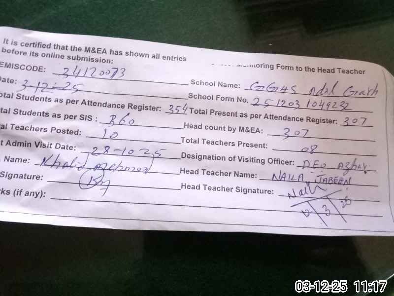 | EMIS Code: 34120073 | Name of School: GGHS ADIL GARH | |||