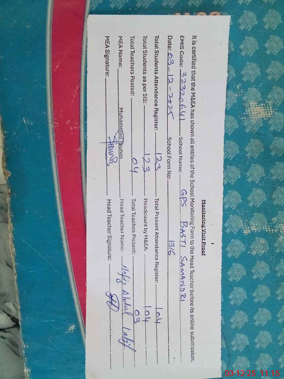 | Attendance Register | Head Teacher | MEA with School | Visit Proof |