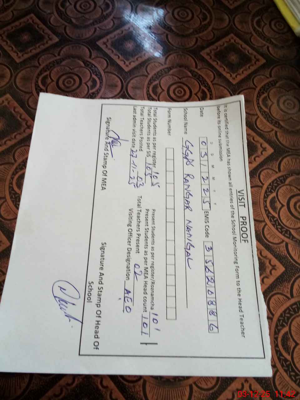 | Attendance Register | Head Teacher | MEA with School | Visit Proof |