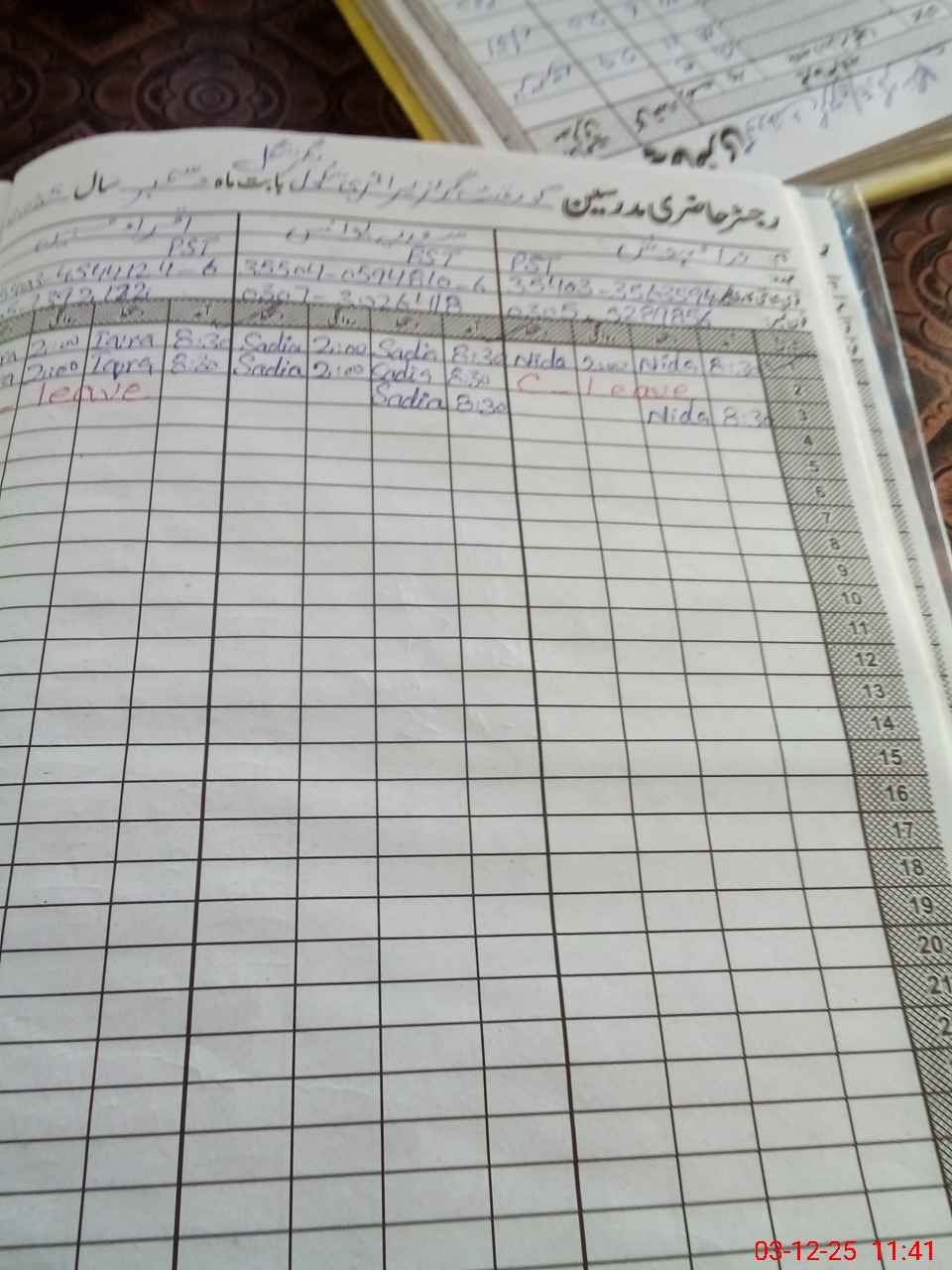 | CNIC | Full Name | Designation | R/C | Absence During Last Calender Month |