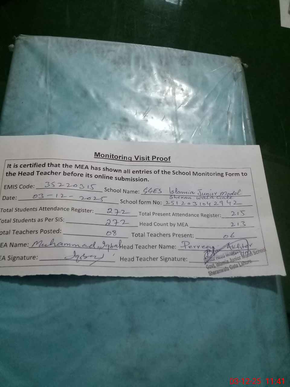 | Attendance Register | Head Teacher | MEA with School | Visit Proof |