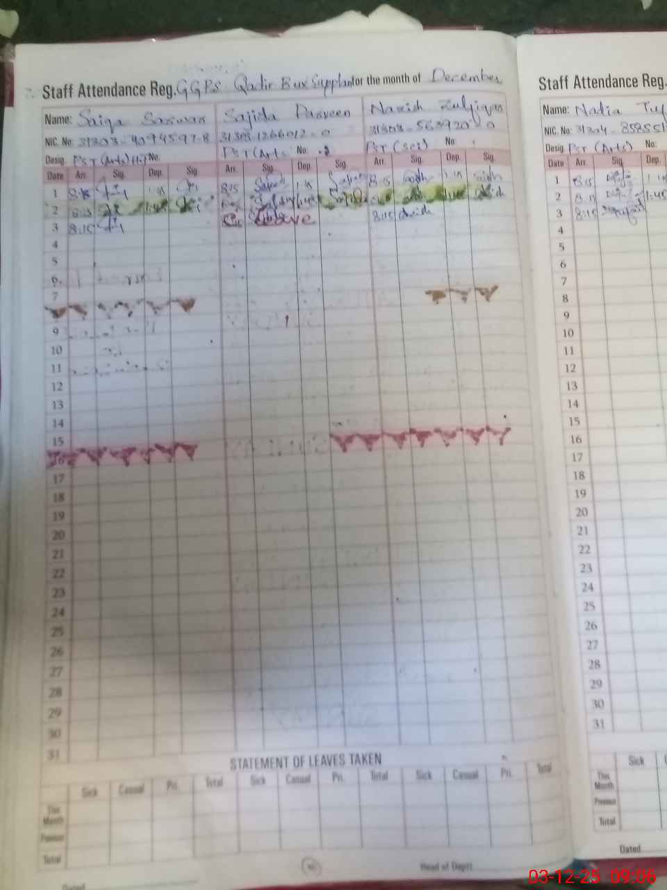 | CNIC | Full Name | Designation | R/C | Absence During Last Calender Month |