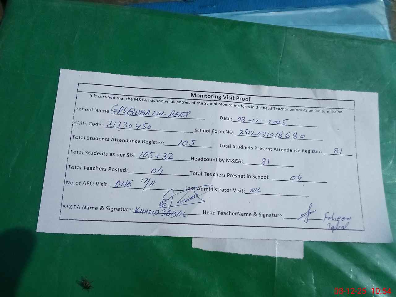 | EMIS Code: 31330450 | Name of School: GPS QUBA LAL PEER | |||