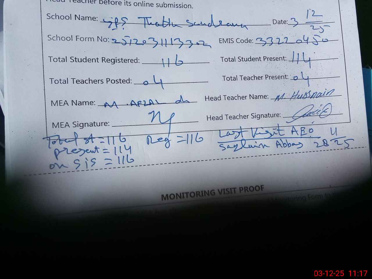 | Attendance Register | Head Teacher | MEA with School | Visit Proof |
