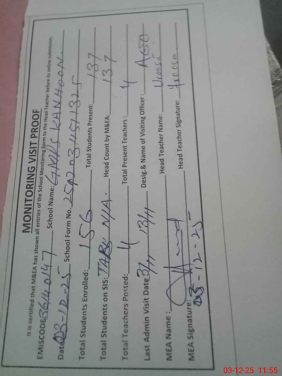 | Attendance Register | Head Teacher | MEA with School | Visit Proof |