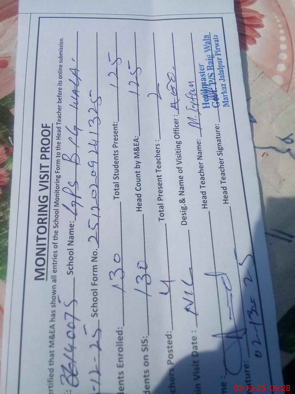 | Attendance Register | Head Teacher | MEA with School | Visit Proof |