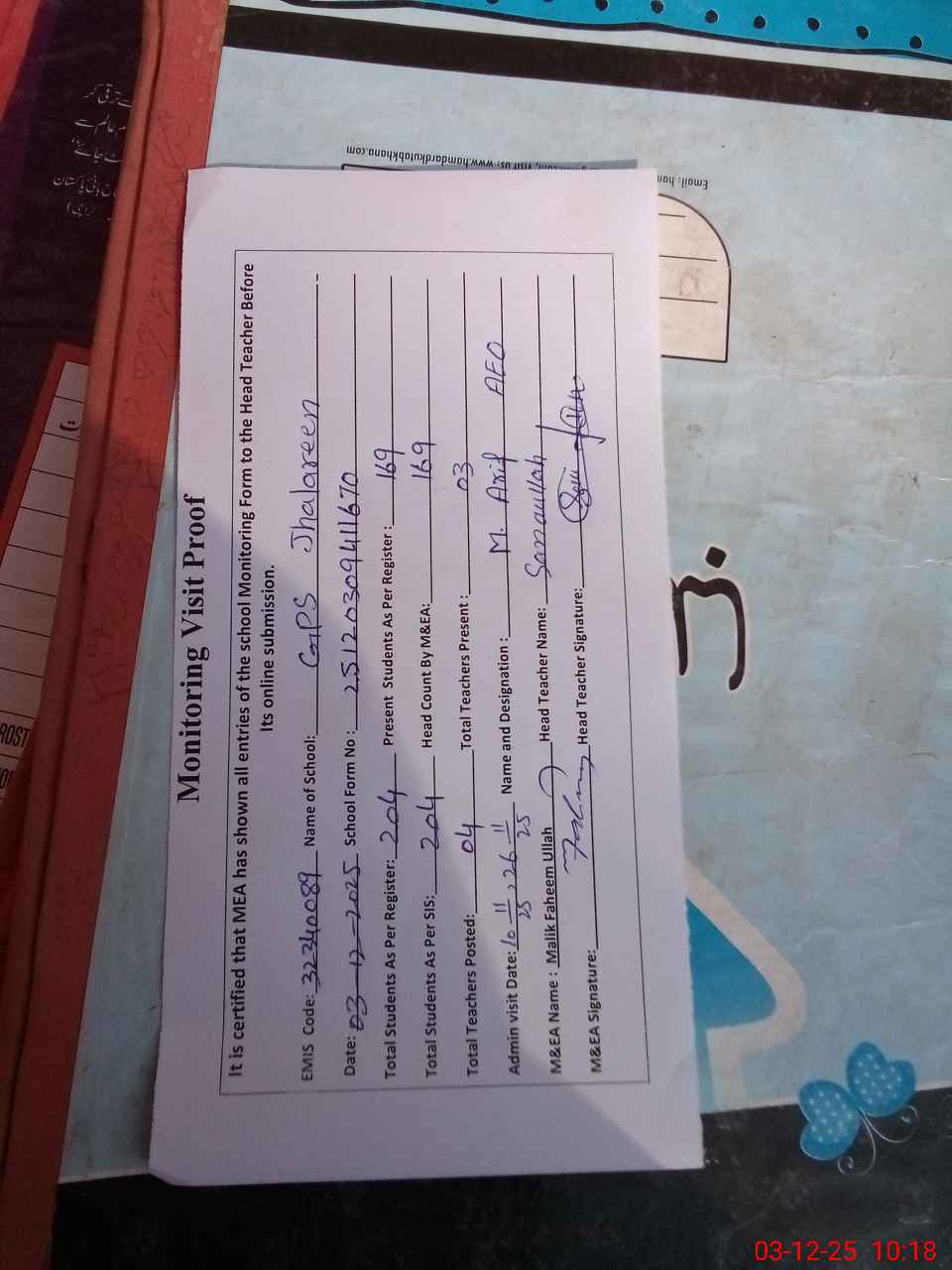 | Attendance Register | Head Teacher | MEA with School | Visit Proof |
