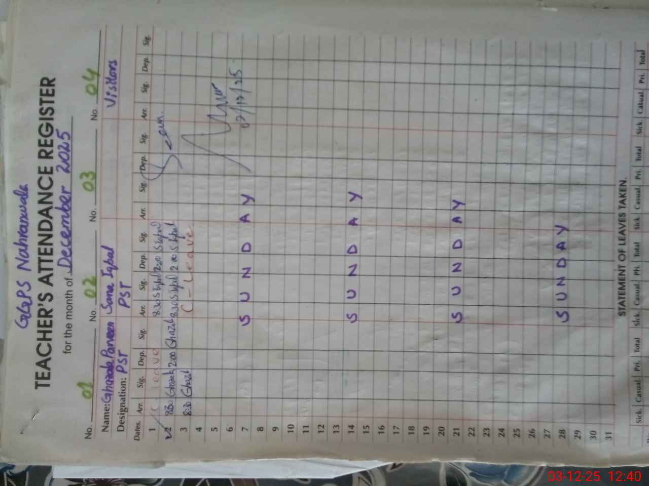 | CNIC | Full Name | Designation | R/C | Absence During Last Calender Month |
