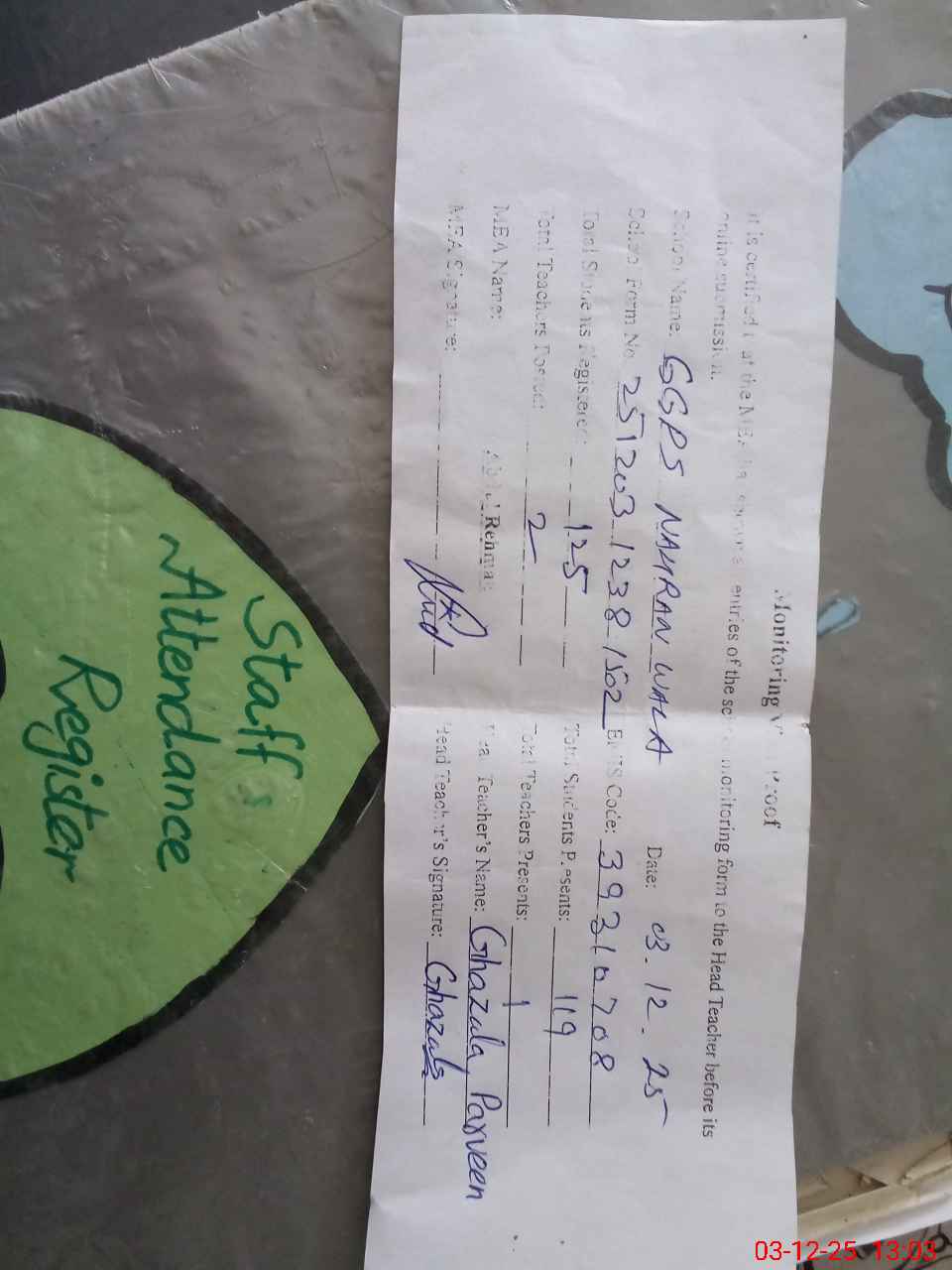 | Attendance Register | Head Teacher | MEA with School | Visit Proof |