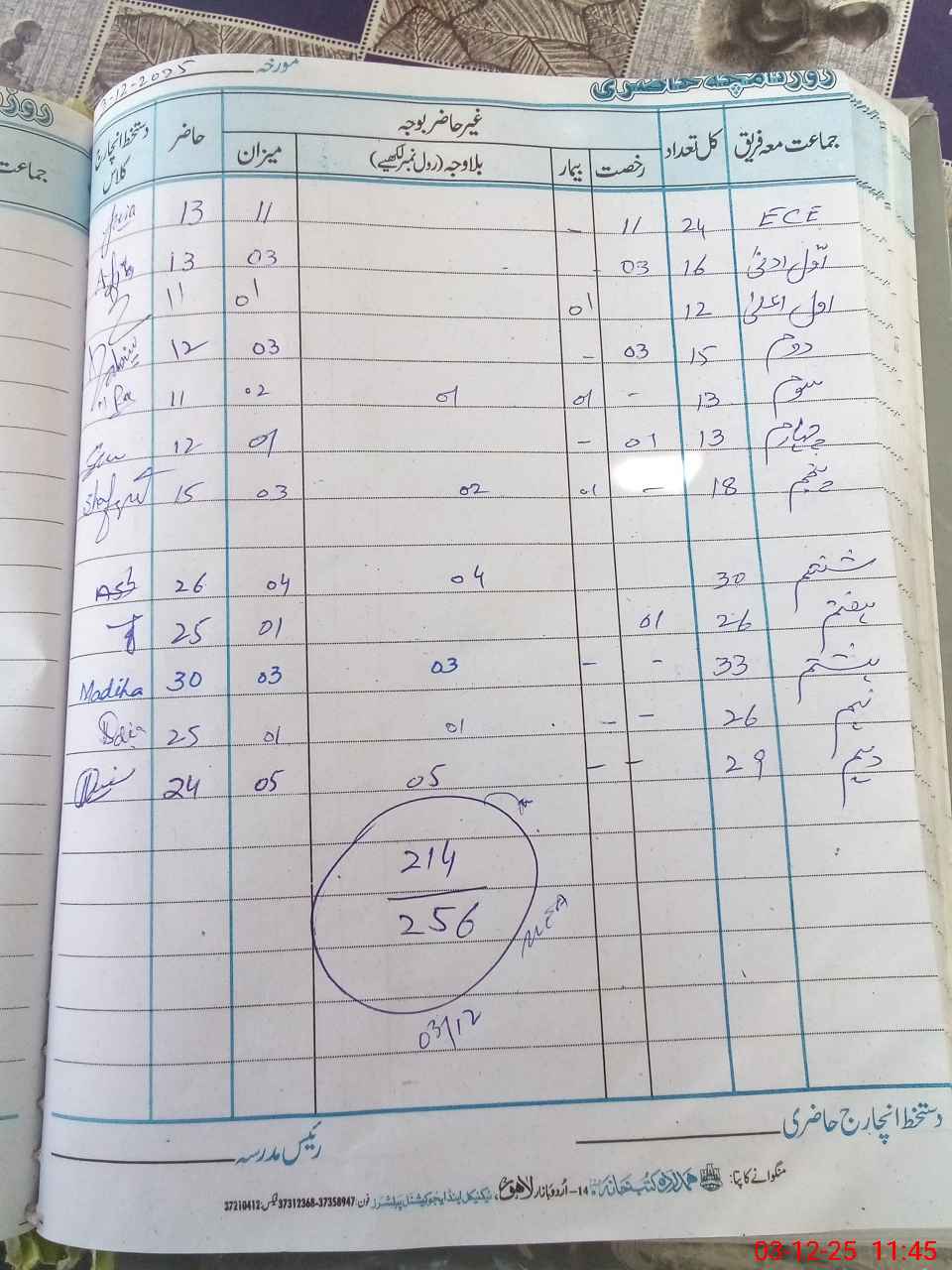 | Total Students Present | 0 | 12 | 10 | 13 | 10 | 12 | 15 | 26 | 25 | 30 | 25 | 24 | 214 | |||