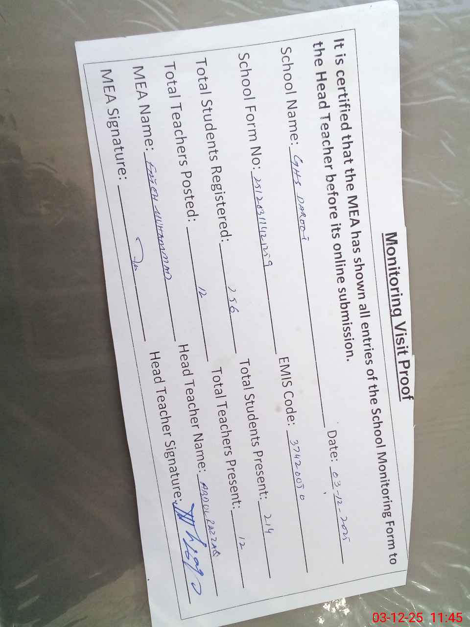| Attendance Register | Head Teacher | MEA with School | Visit Proof |