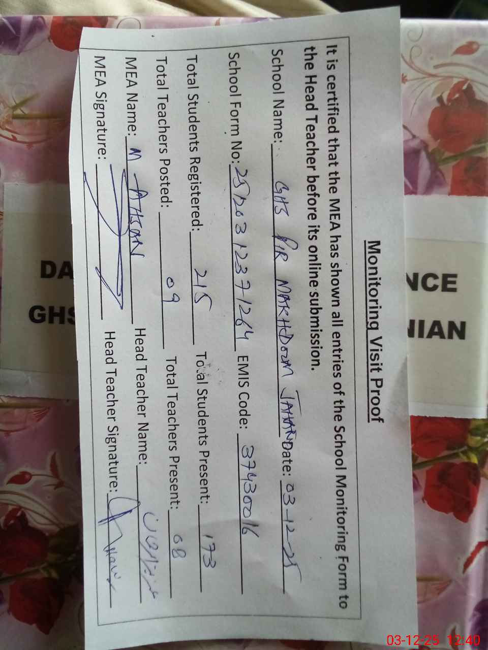 | Certified that this School was Inspected by the Undersigned MEA/DMO Today and the Information Stated Above is as Per Record. | |||||