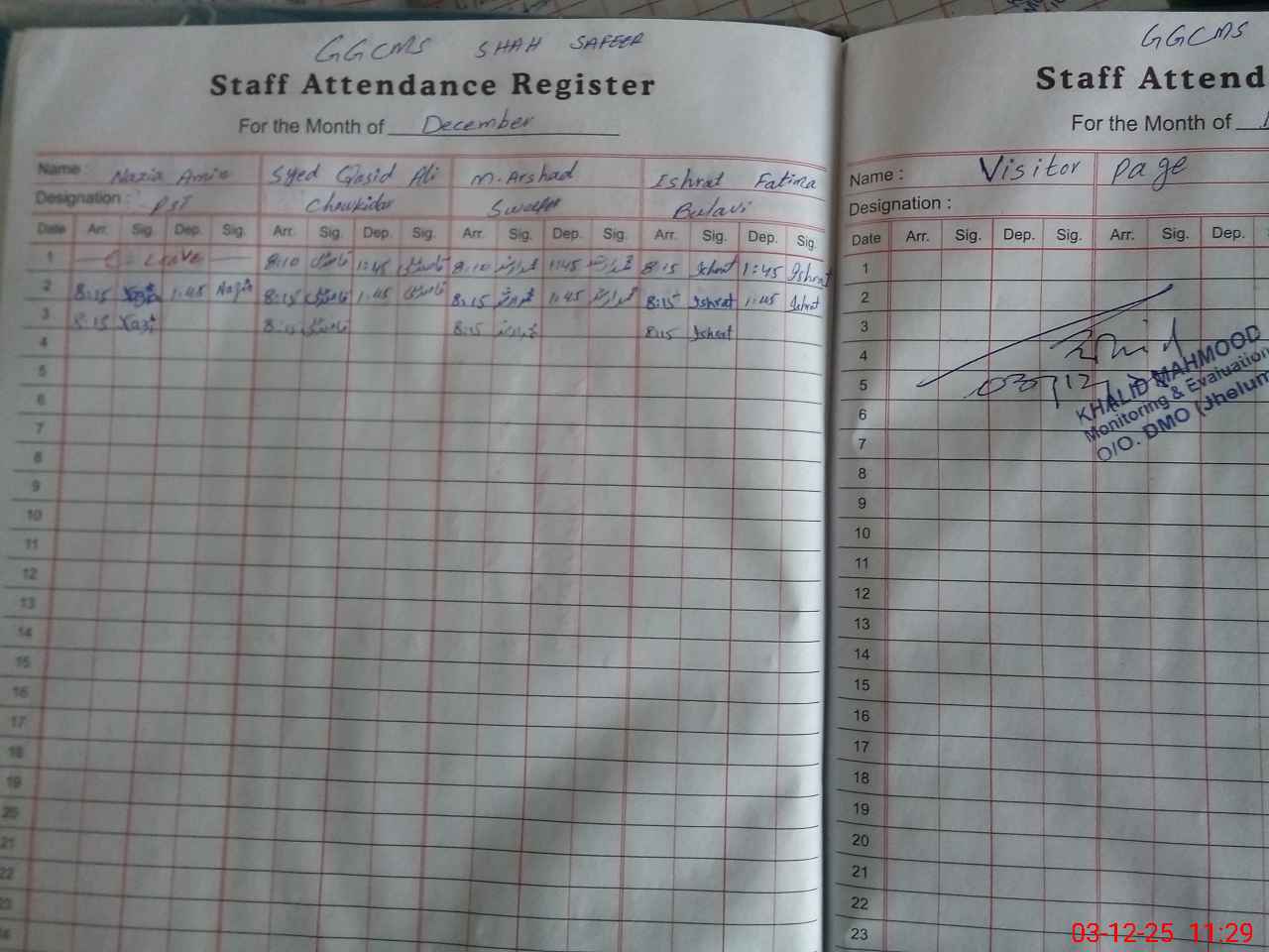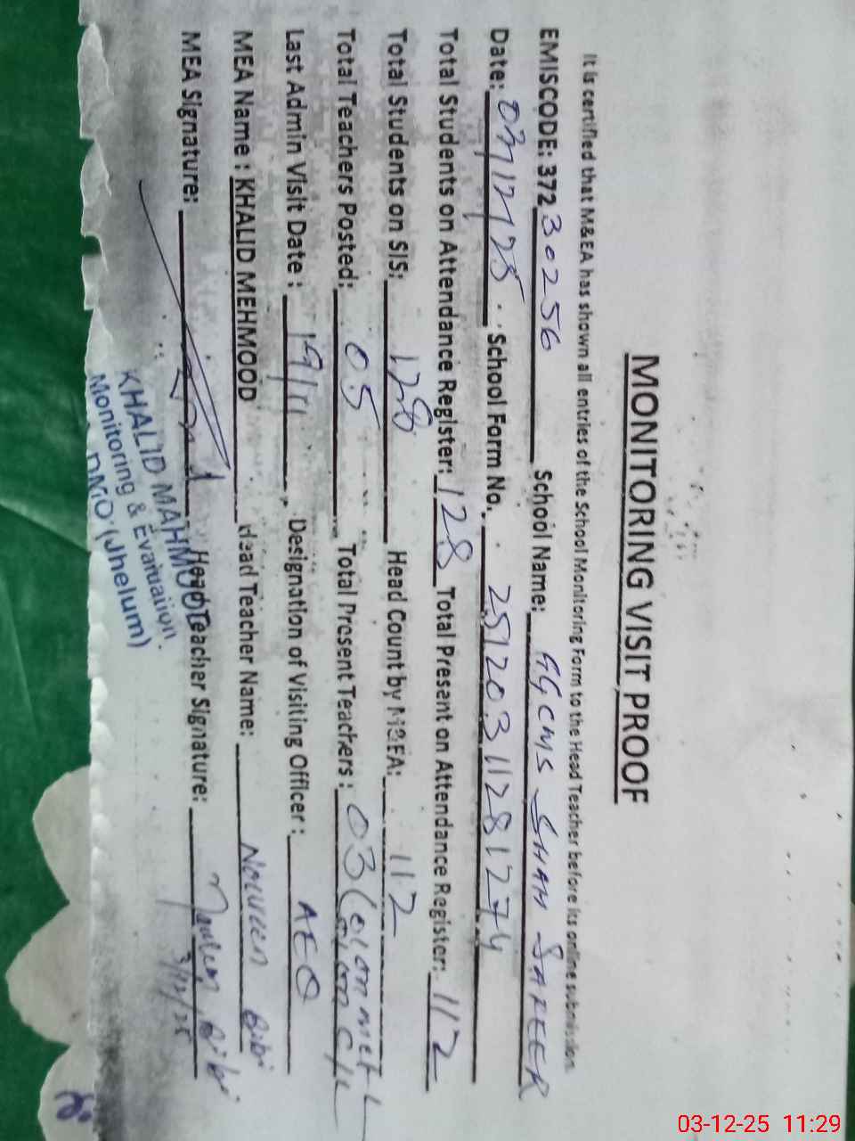 | Attendance Register | Head Teacher | MEA with School | Visit Proof |