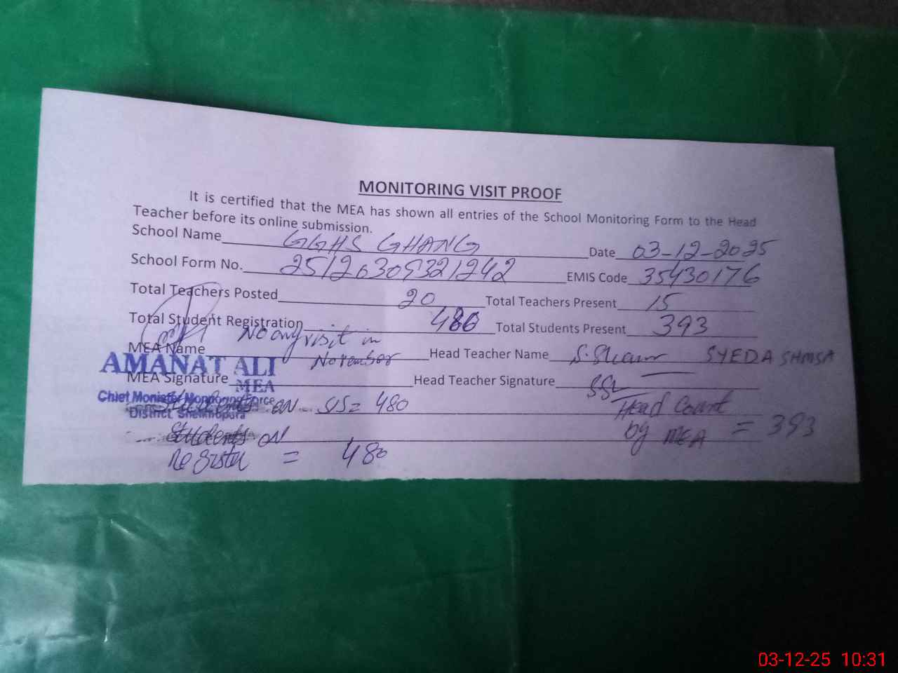 | Attendance Register | Head Teacher | MEA with School | Visit Proof |