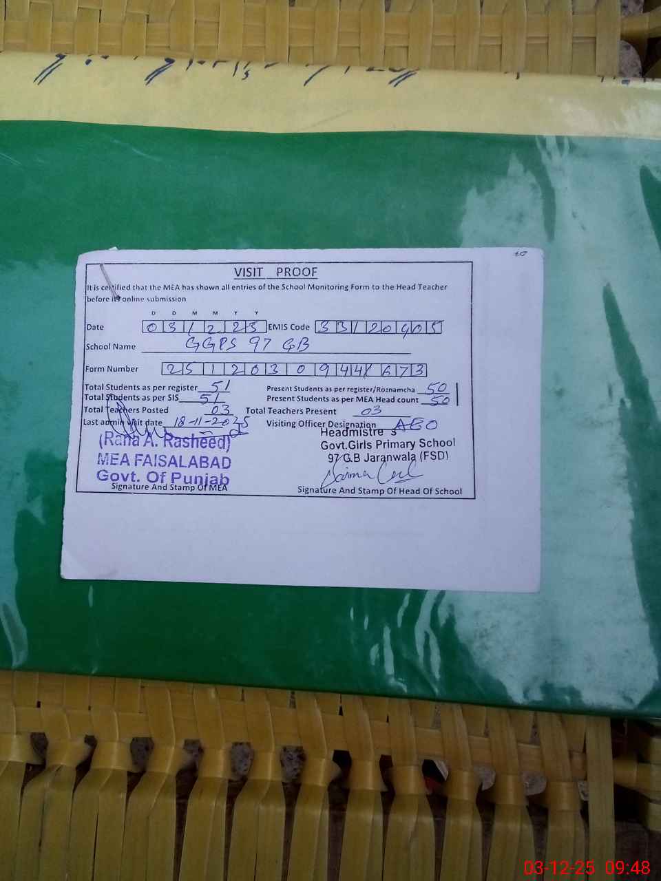 | EMIS Code: 33120405 | Name of School: GGPS CHAK 97 GB JARANWALA | |||