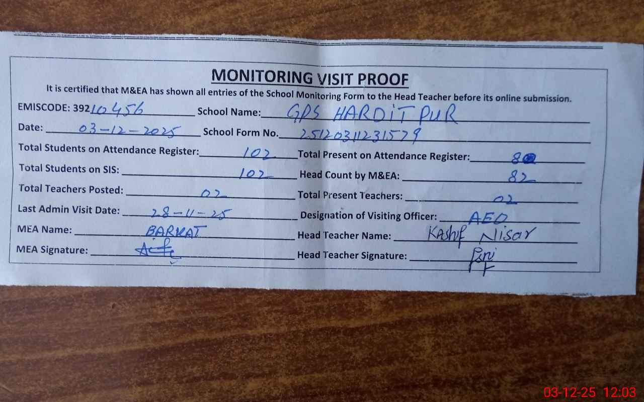 | EMIS Code: 39210456 | Name of School: GPS HARDIT PUR | |||