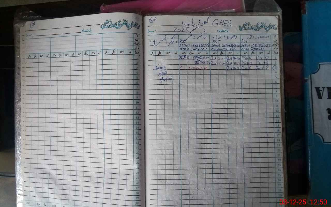 | CNIC | Full Name | Designation | R/C | Absence During Last Calender Month |