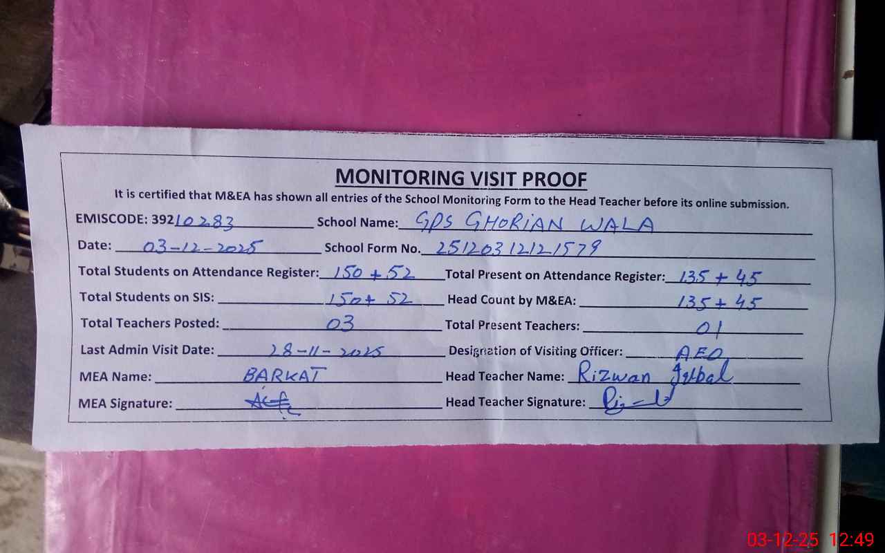 | EMIS Code: 39210283 | Name of School: GPS GHORIAN WALA | |||