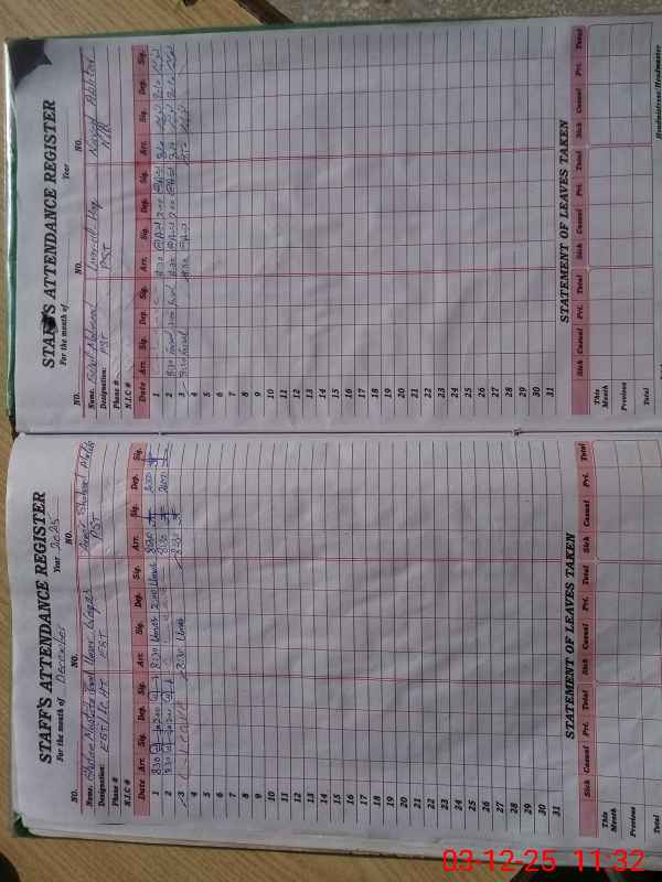 | CNIC | Full Name | Designation | R/C | Absence During Last Calender Month |