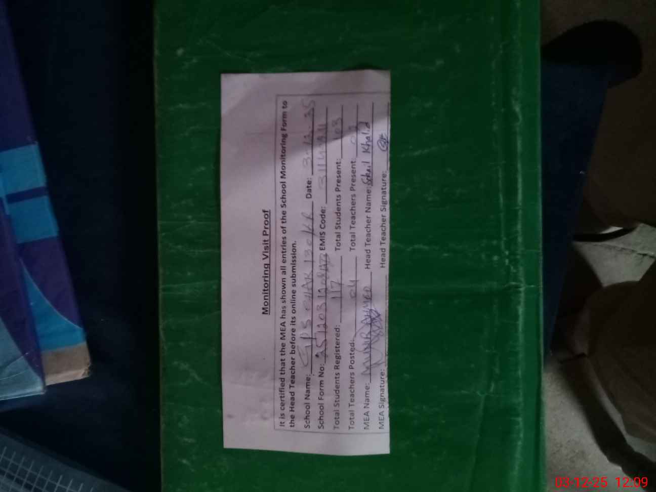 | Attendance Register | Head Teacher | MEA with School | Visit Proof |