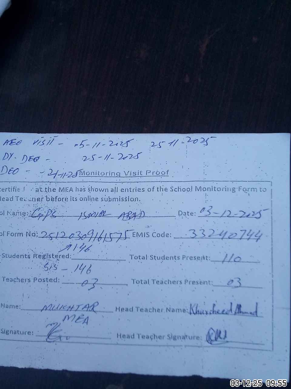 | Attendance Register | Head Teacher | MEA with School | Visit Proof |