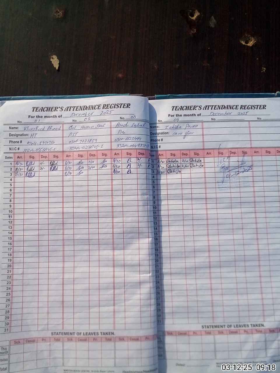| CNIC | Full Name | Designation | R/C | Absence During Last Calender Month |